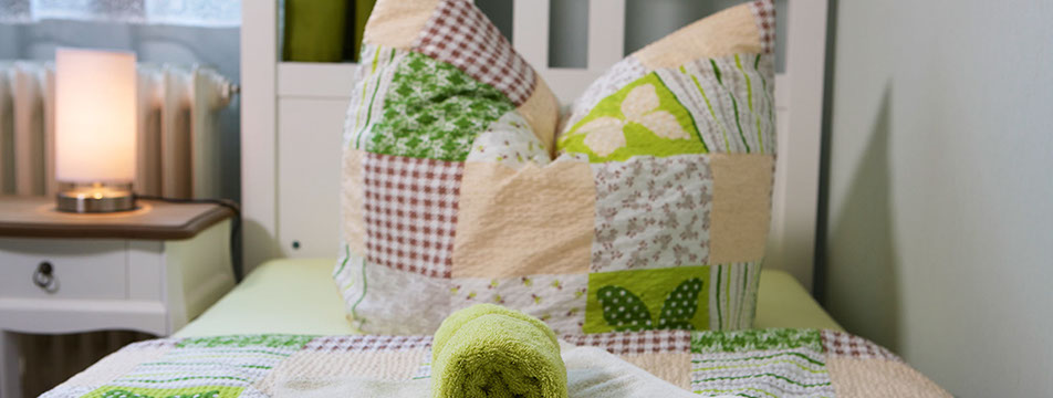 Bettwäsche & Handtücher sind kostenlos, ebenso der Parkplatz direkt vor der Pension | Kleine Küche für Eigenverpflegung mit Kühl-/Gefrierkombination auf dem Flur