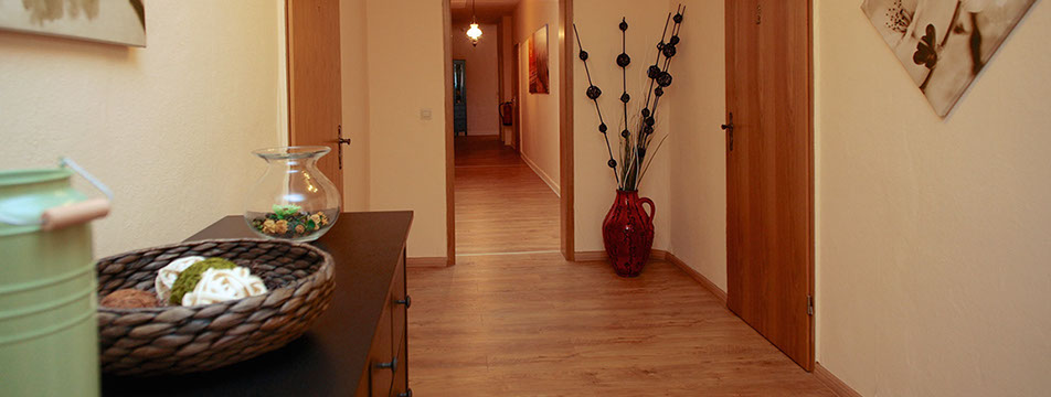 Bettwäsche & Handtücher sind kostenlos, ebenso der Parkplatz direkt vor der Pension | Kleine Küche für Eigenverpflegung mit Kühl-/Gefrierkombination auf dem Flur