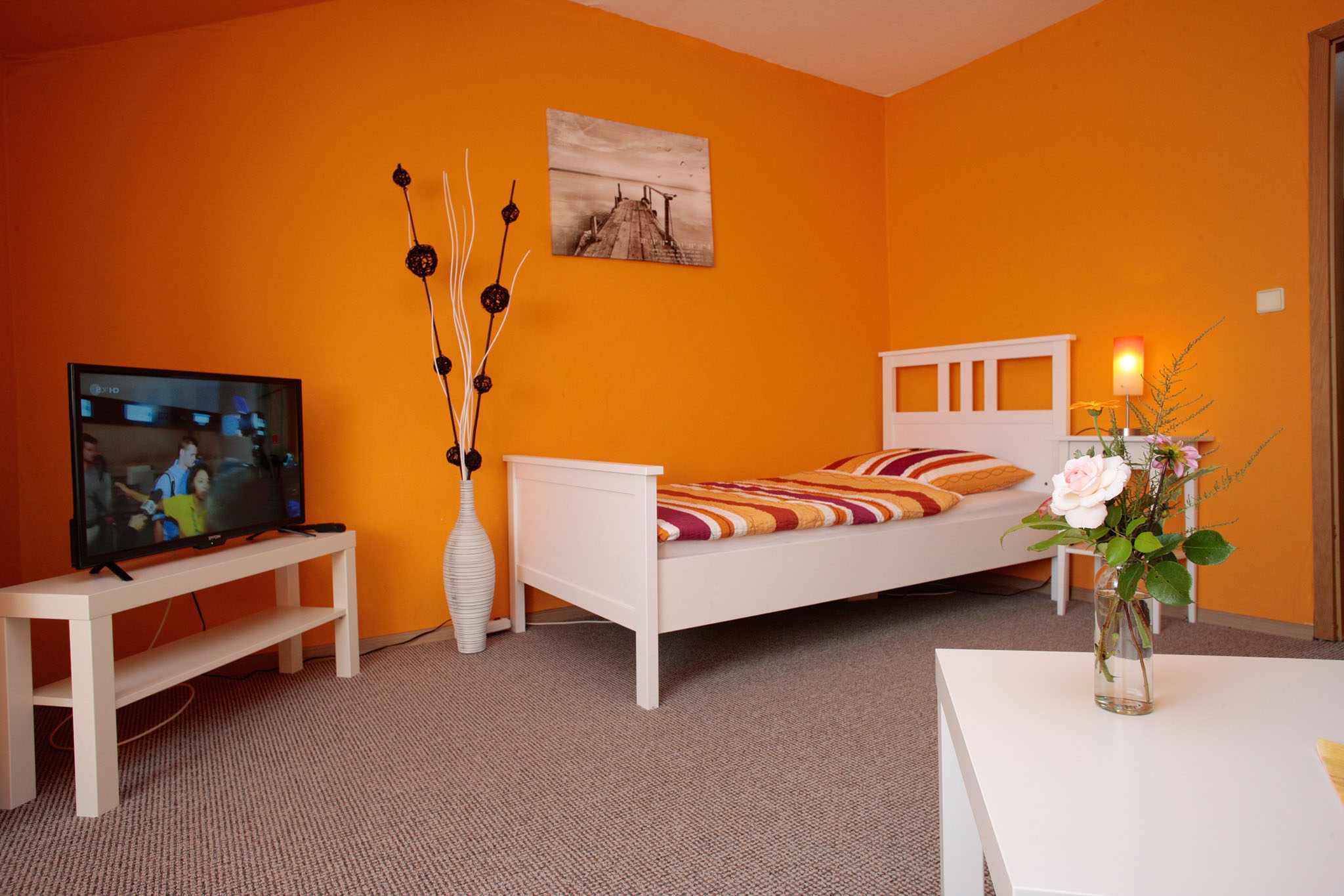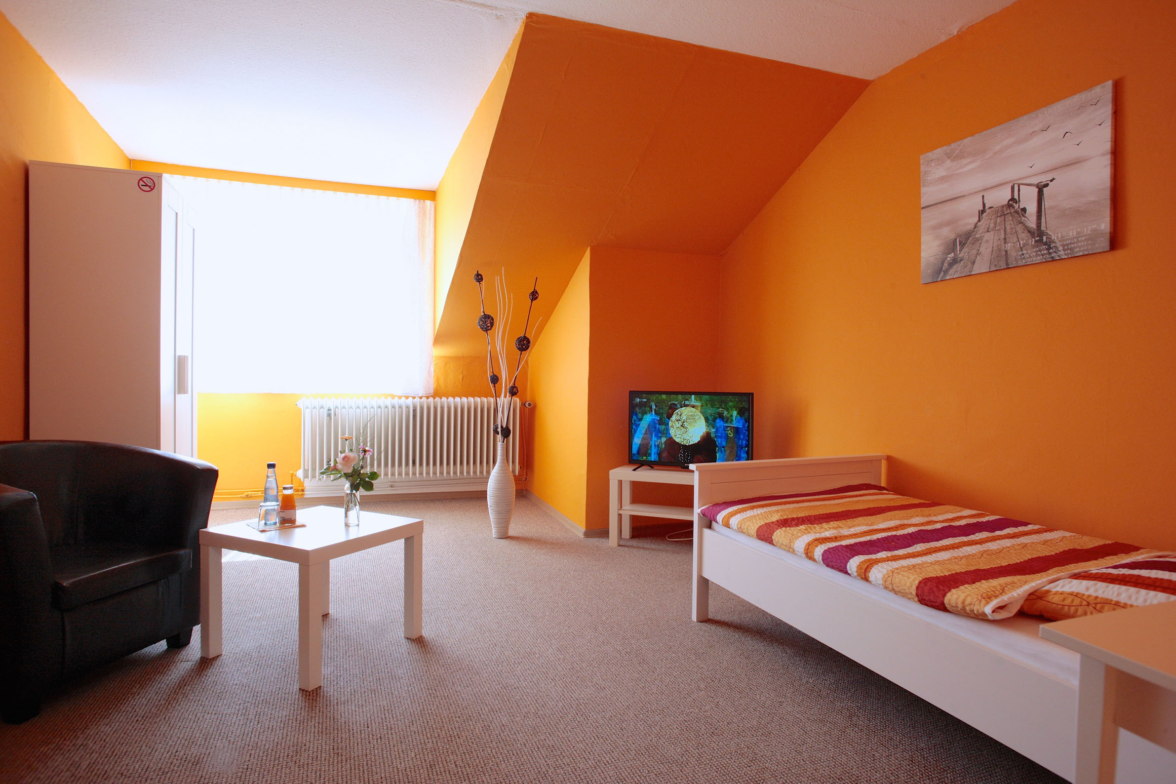 Einzelbett | TV | großzügiger Kleiderschrank | Sitzgelegenheit | WLAN | Waschgelegenheit im Zimmer | Bad/WC auf dem Flur